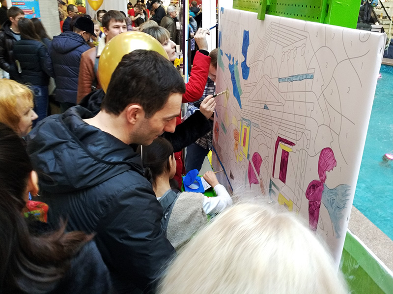 Мы подготовили для посетителей большие раскраски с достопримечательностями города Иркутска. Гости выставки раскрашивали картины по номерам красками нашего собственного производства «Баир», а за проделанную работу, каждый получал наклейку в пригласительный билет для розыгрыша призов.